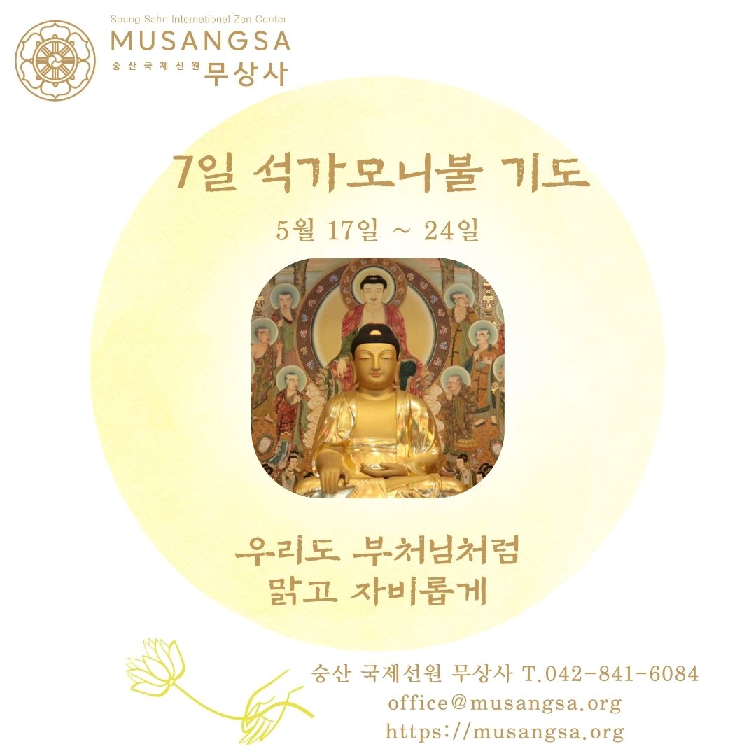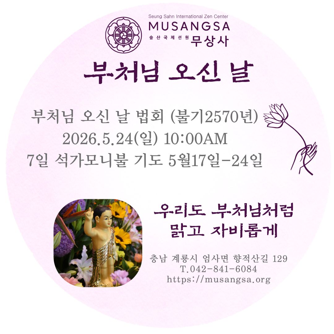 장소: 충청남도 계룡시 엄사면 향적산길 129 참가를 원하시는 분은 무상사 홈페이지 또는아래 신청하기를 통해 신청서를 제출해 주시면 됩니다. 참가비 : ₩50,000 문의: 이메일 : office@musangsa.org / T: 042-841 6084 신청하기